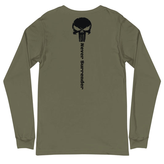 MGG Long Sleeve Shirt, White Logo, Never Surrender Back Skull -Multi Color